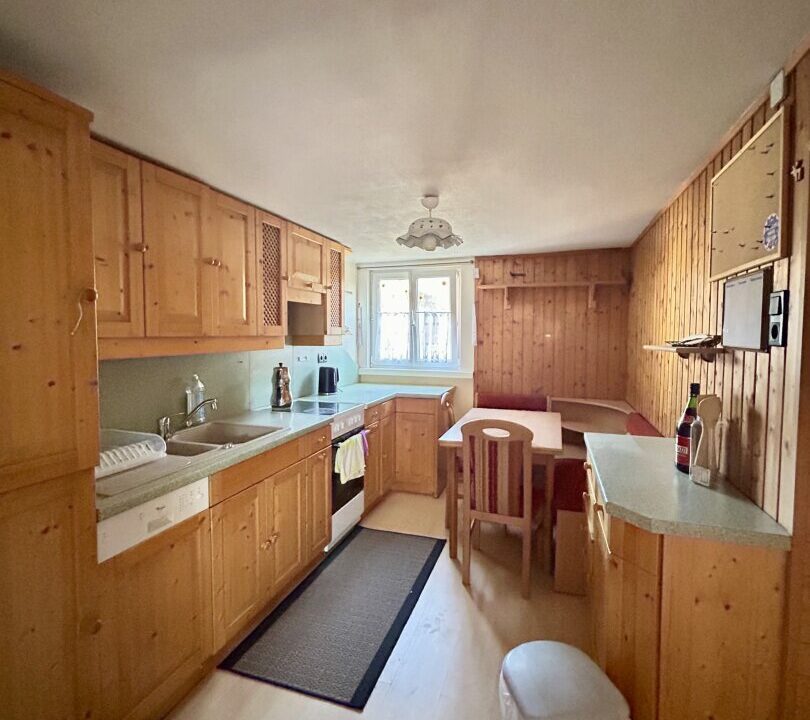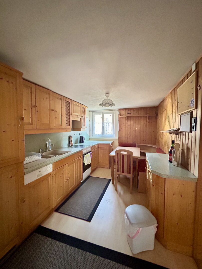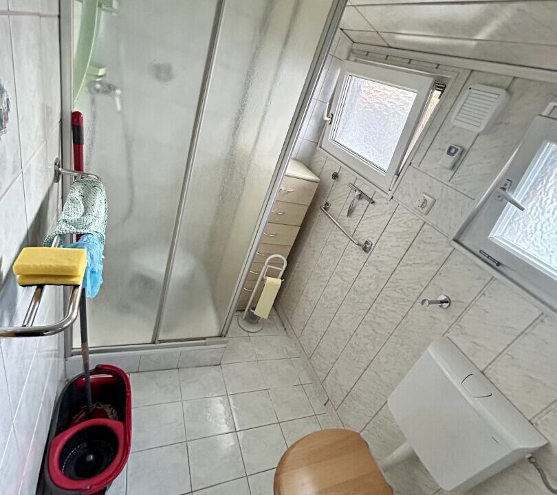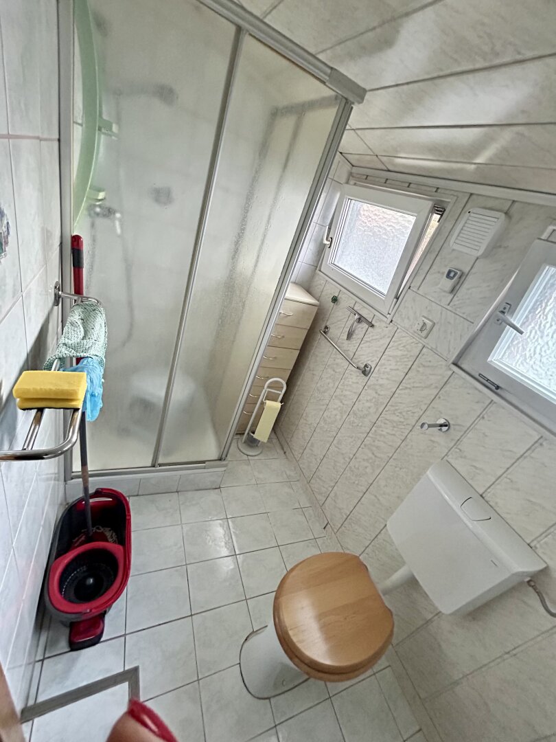 Ein pflegeleichter Kunststoffboden, eine funktionale Einbauküche sowie ein Badezimmer mit Fenster und Dusche sorgen für komfortables Wohnen. Holz- und moderne Elemente schaffen eine warme, einladende Atmosphäre. Der schöne Grünblick vermittelt Ruhe und Natur – mitten in der Stadt.