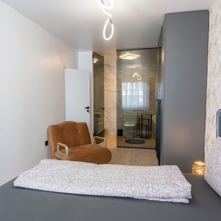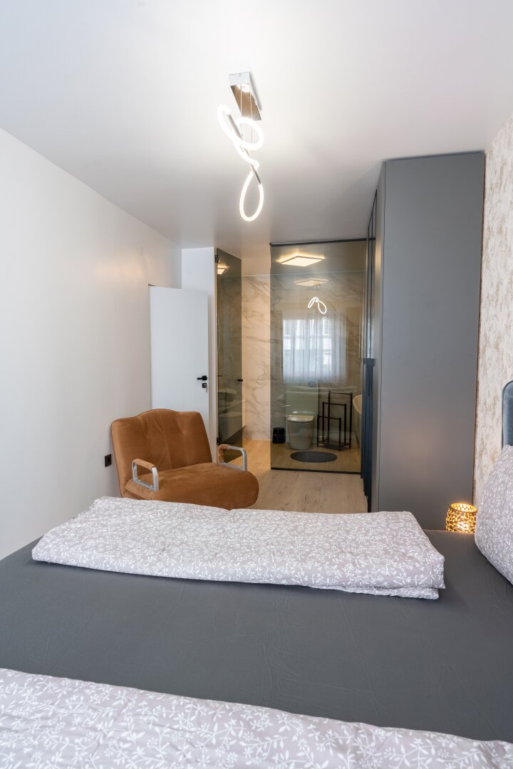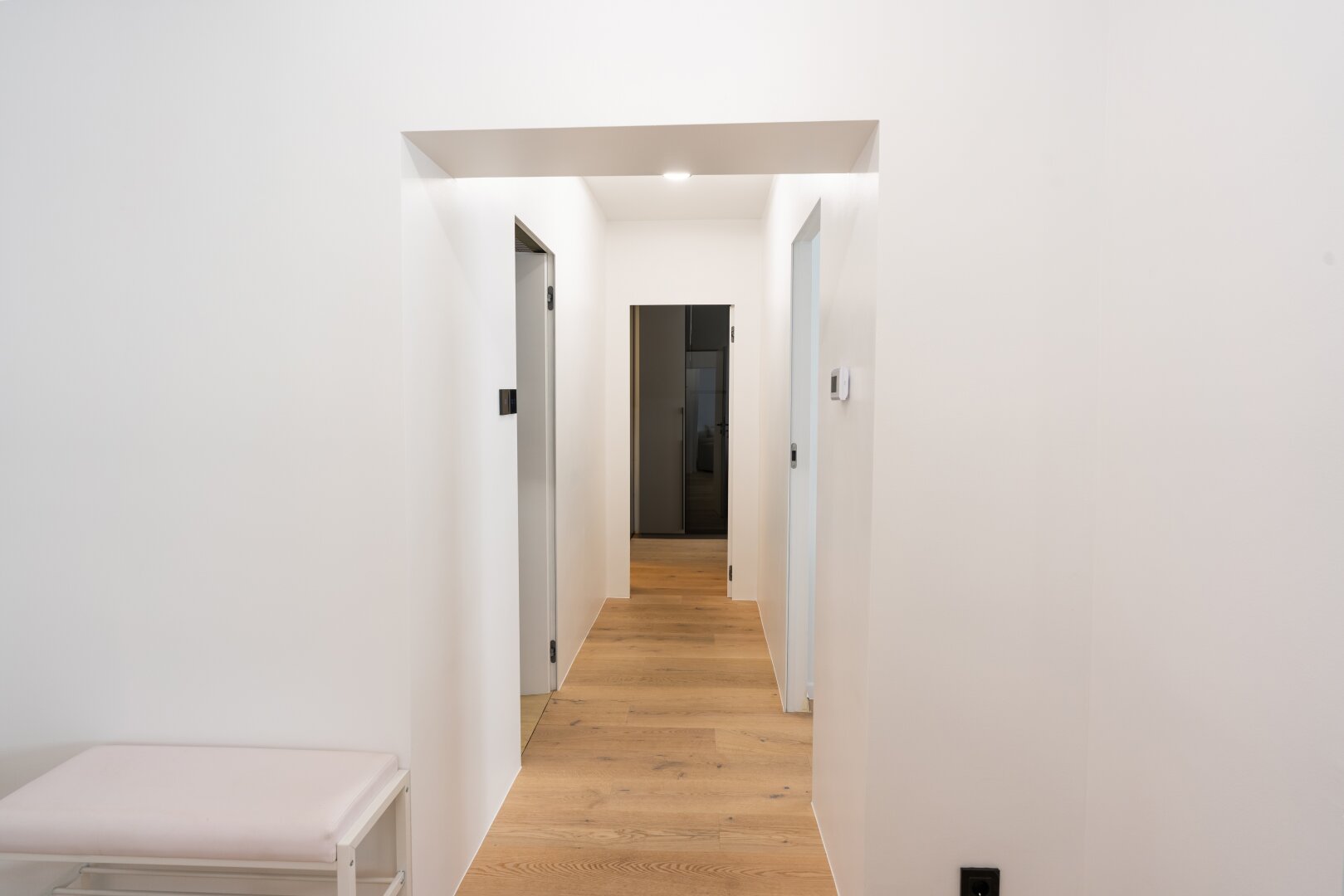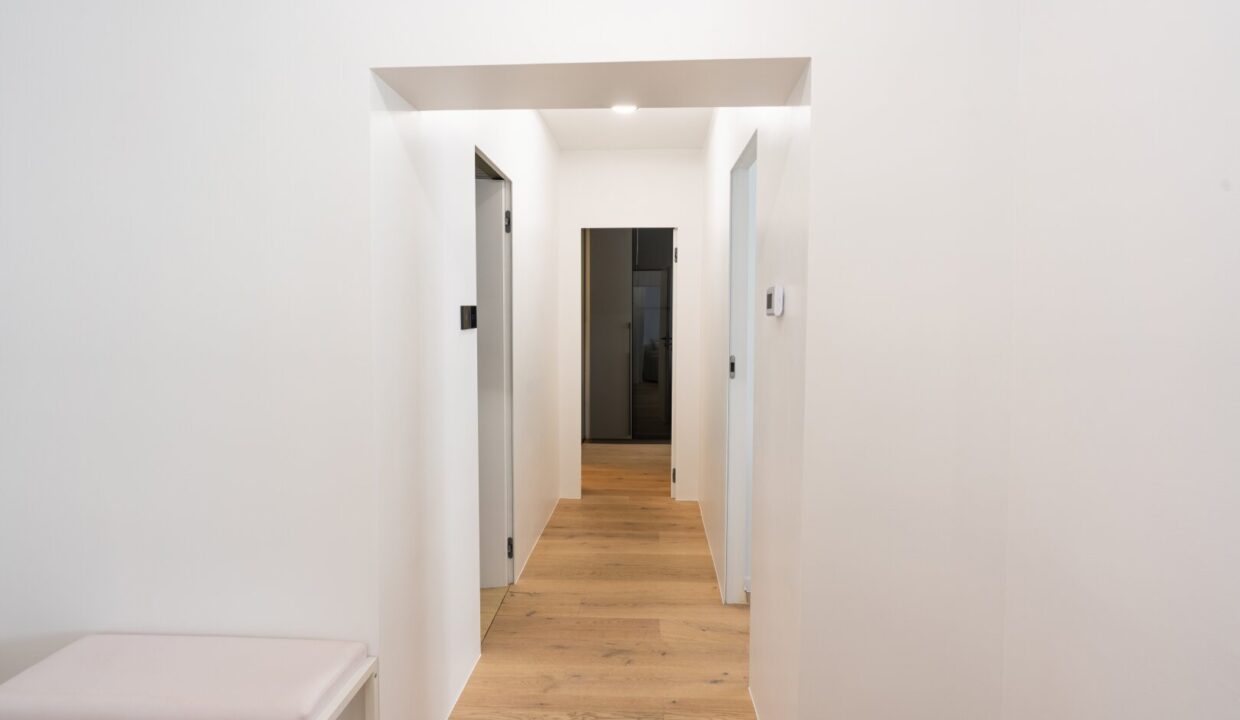 Links vom Eingangsbereich gelangt man über einen gangartigen Vorraum zu den beiden Schlafzimmern, den Nassräumen sowie dem Abstellraum.