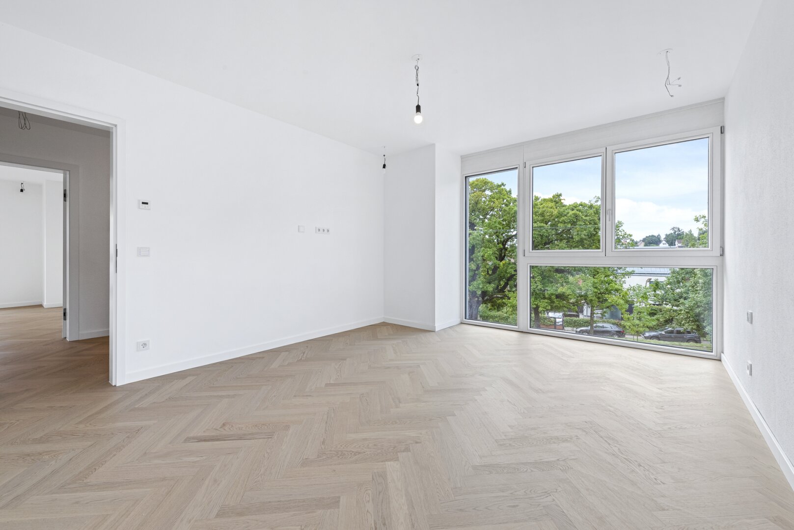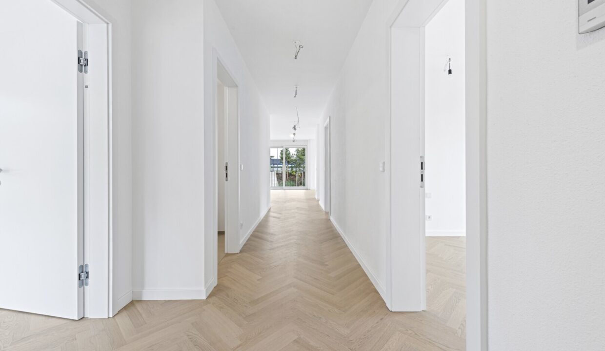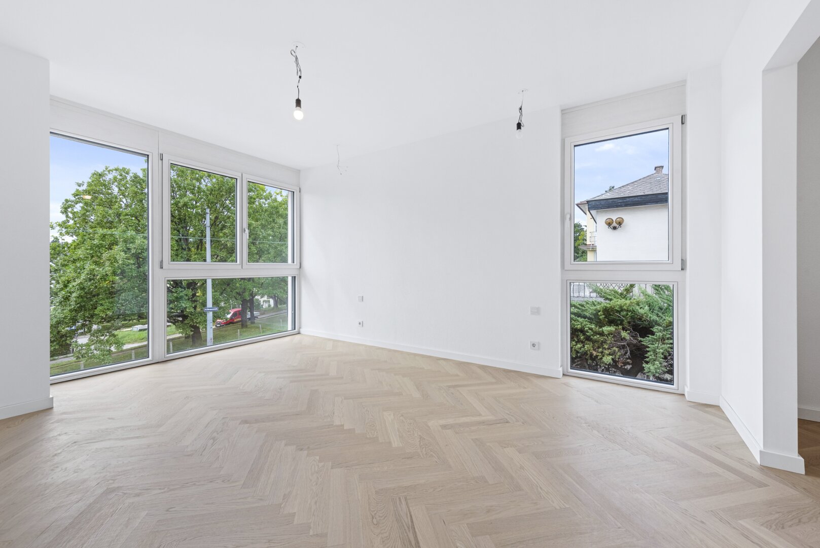 Von hier aus sind nicht nur die einzelnen Bereiche der Wohnung zentral zu begehen, sondern man genießt bereits einen einladenden Blick in das Herzstück der Wohnung, dem geräumigen Wohnbereich mit seinem vorgelagerten Balkon samt Grünblick.