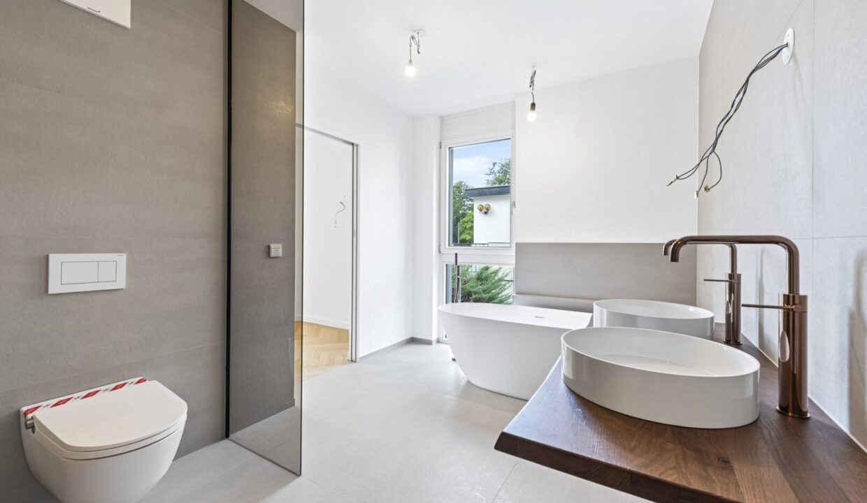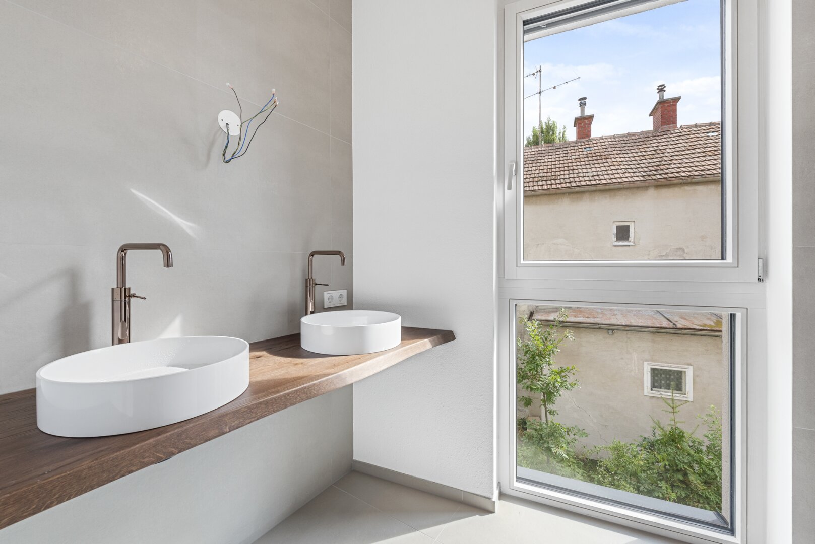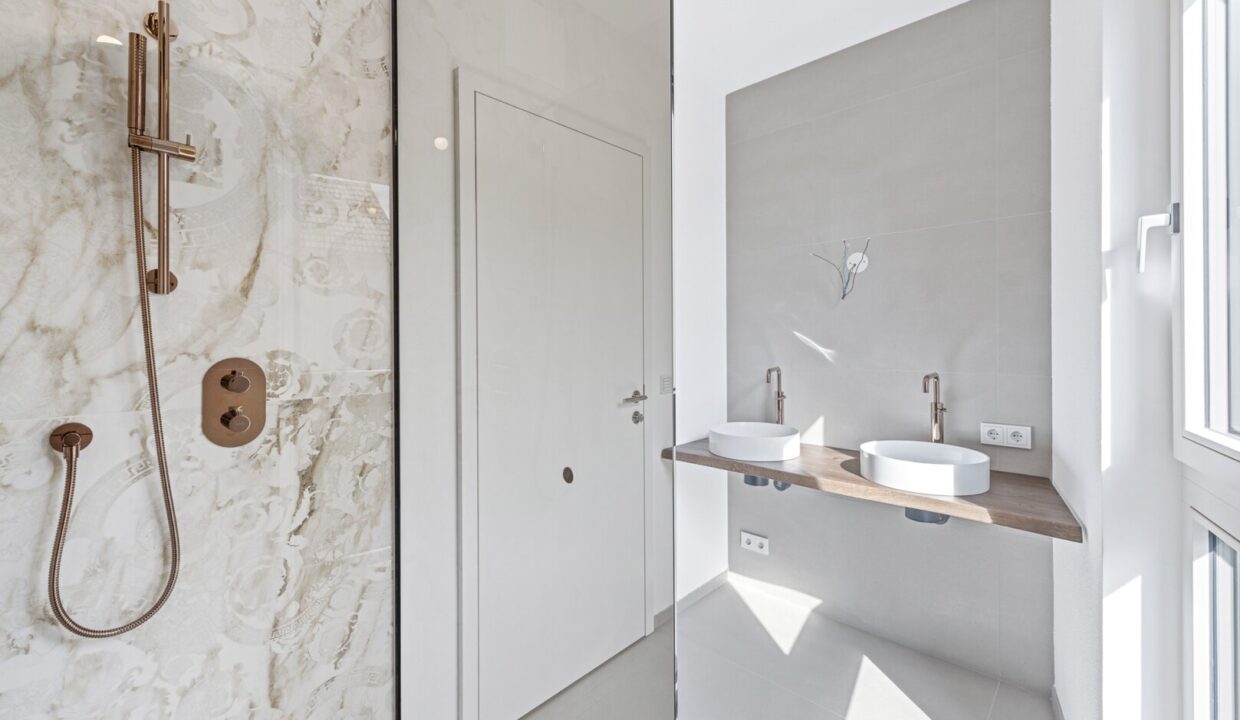 Die Bäder sind mit burgbad-Waschbecken und Waschtischplatten ausgestattet. Burgbad ist seit 2016 klimaneutral und trägt renommierte Nachhaltigkeitssiegel wie Blauer Engel und EcoVadis Bronze. Mineralguss-Waschbecken bestehen zu rund 80 % aus natürlichen Rohstoffen. Der innovative CleanFlow-Siphon reduziert Wasserverbrauch, Materialeinsatz und Reinigungsmittel – ein perfektes Zusammenspiel von Design, Hygiene und Nachhaltigkeit.