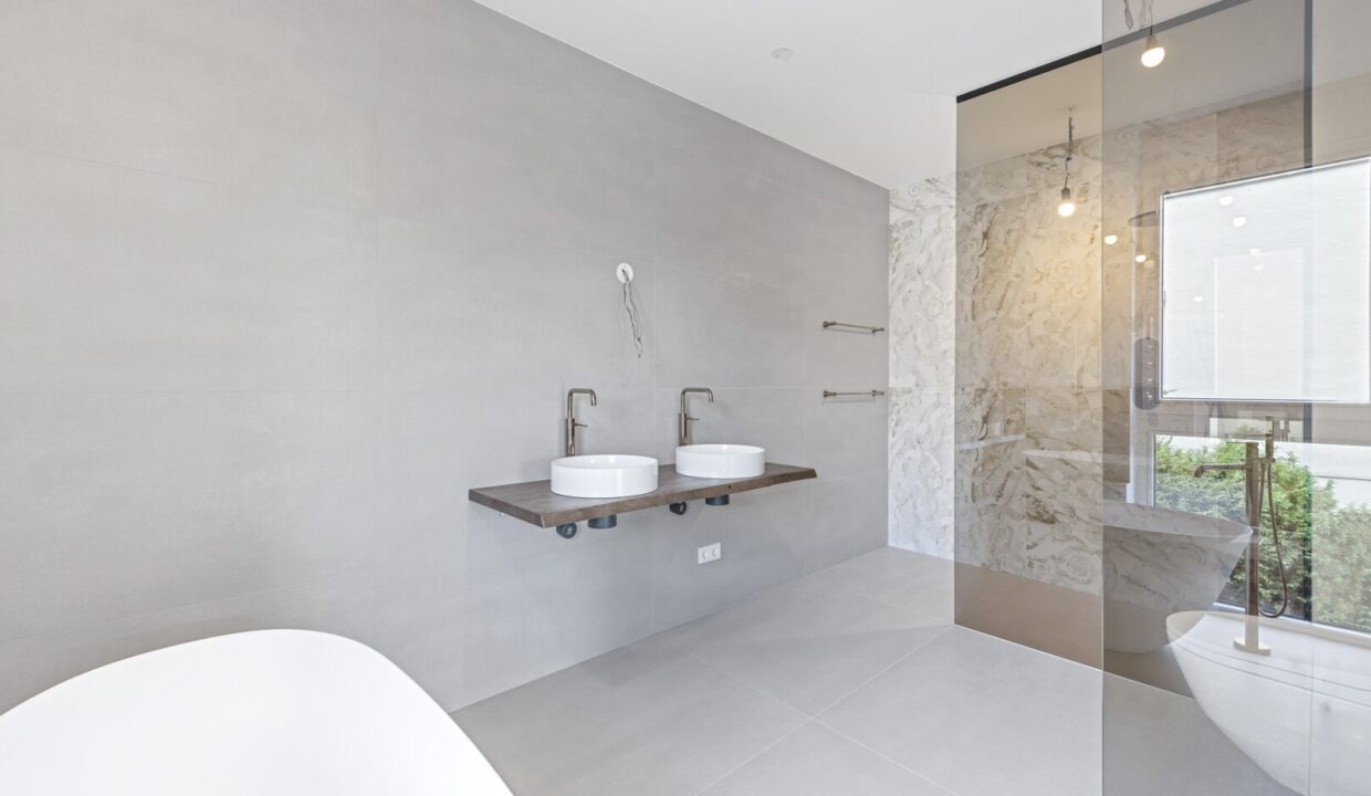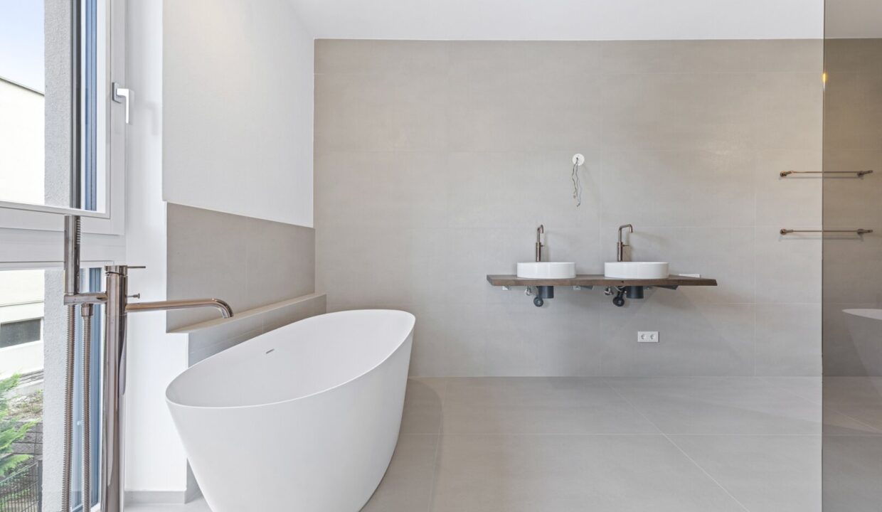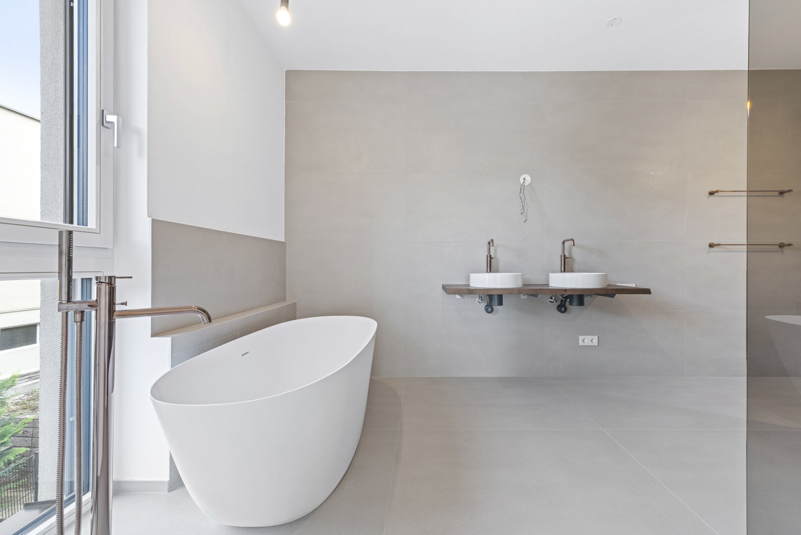 In Bädern und auf Terrassen kommt großformatiges Feinsteinzeug zum Einsatz: