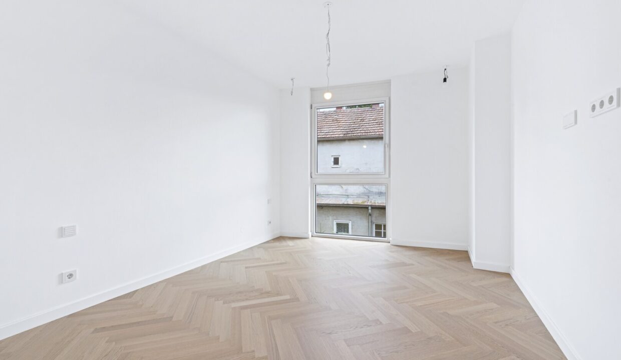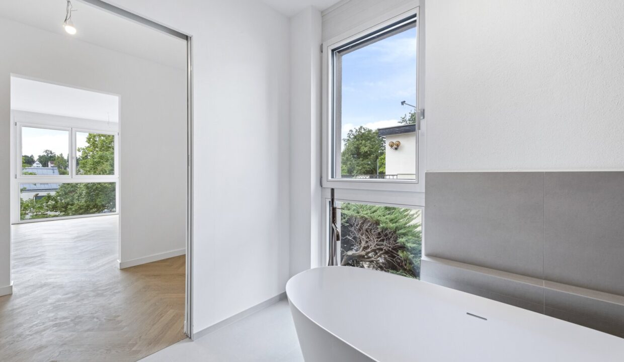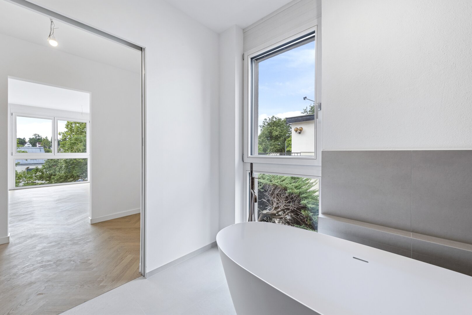 Nicht weniger spektakulär und vor allem ideal aufgeteilt ist der Master-Bedroom der Wohnung, welcher knapp 19 m² umfasst und nicht nur über ein Tageslicht-Badezimmer mit Dusche, Wanne, WC und Doppelwaschbecken sowie eine begehbare Garderobe verfügt, sondern auch über einen süd/ost-seitigen französischen Balkon mit Wien-Blick. Durch die herrliche Raumhöhe von 2,60 m wirken die einzelnen Bereiche offen und luftig und bieten für hohe Einbauschränke tolle Staumöglichkeiten, um auch für umfangreichere Garderobe geeignet zu sein.