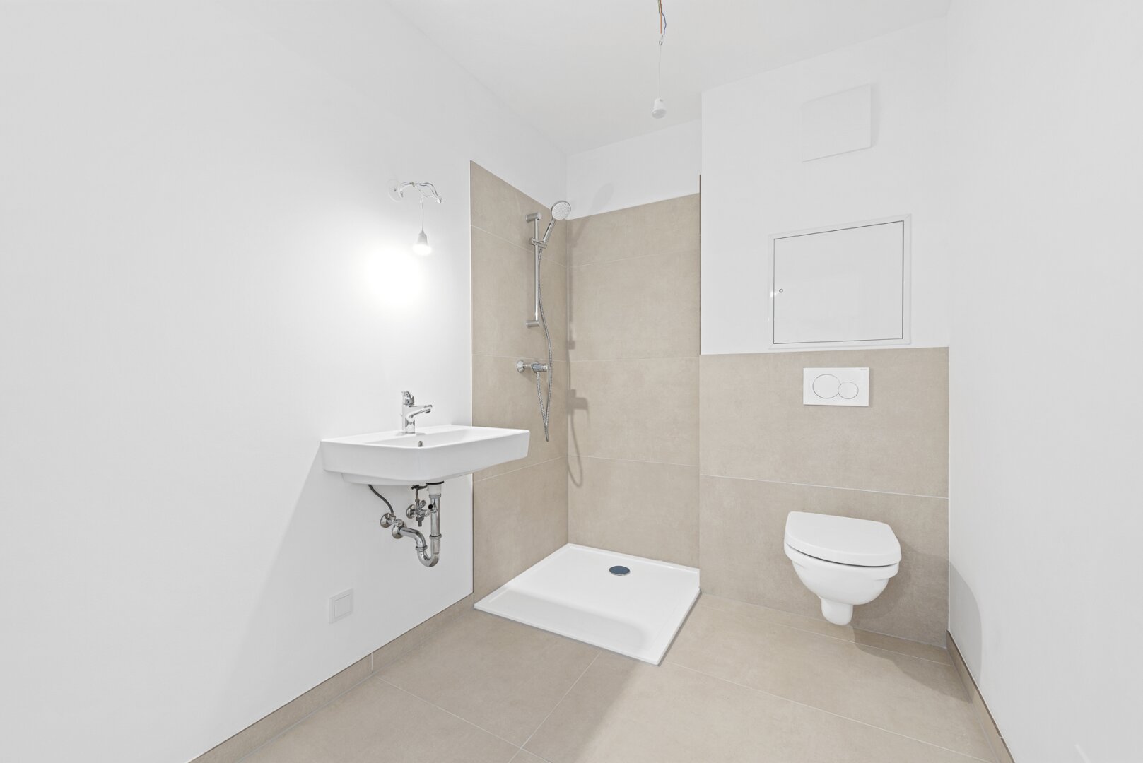 Neben dem Eingangsbereich liegt das moderne Badezimmer mit rund 4,5 m² Größe, welches mit einer Duschkabine, einem Handwaschbecken, einer Toilette und einem Waschmaschinen-Anschluss ausgestattet ist.