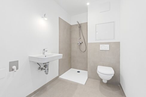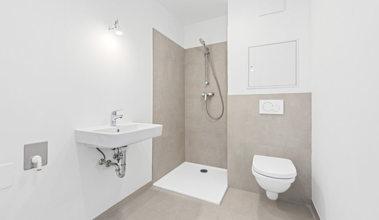 Das Badezimmer wurde mit einer Dusche sowie einem Waschbecken und einer Toilette ausgestattet.
