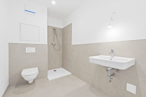 Das Badezimmer wurde mit einer Dusche sowie einem Waschbecken sowie einer Toilette ausgestattet.