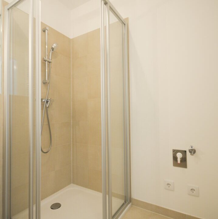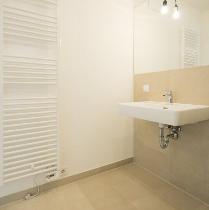 Nach dem Betreten der Wohnung befindet sich zu seiner Rechten ein praktischer Abstellraum. Vis à vis vom Eingang liegt die separate Toilette sowie das wunderbar helle Badezimmer, welches auf fast 4 m² mit einer Dusche, einem Handwaschbecken und Spiegel und einem Waschmaschinen-Anschluss ausgestattet ist.