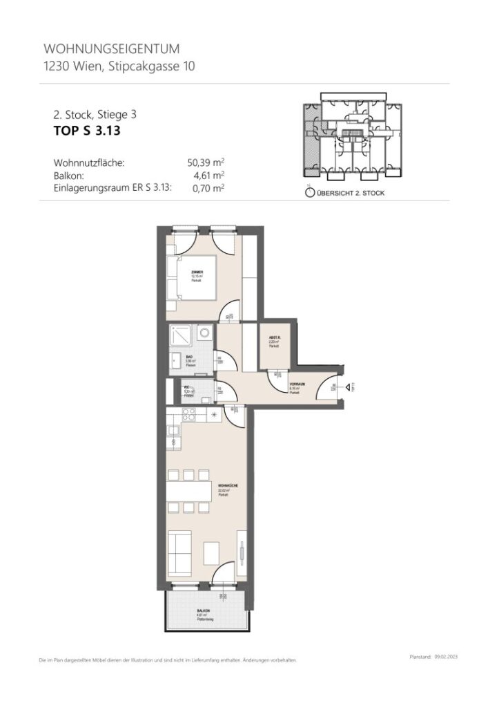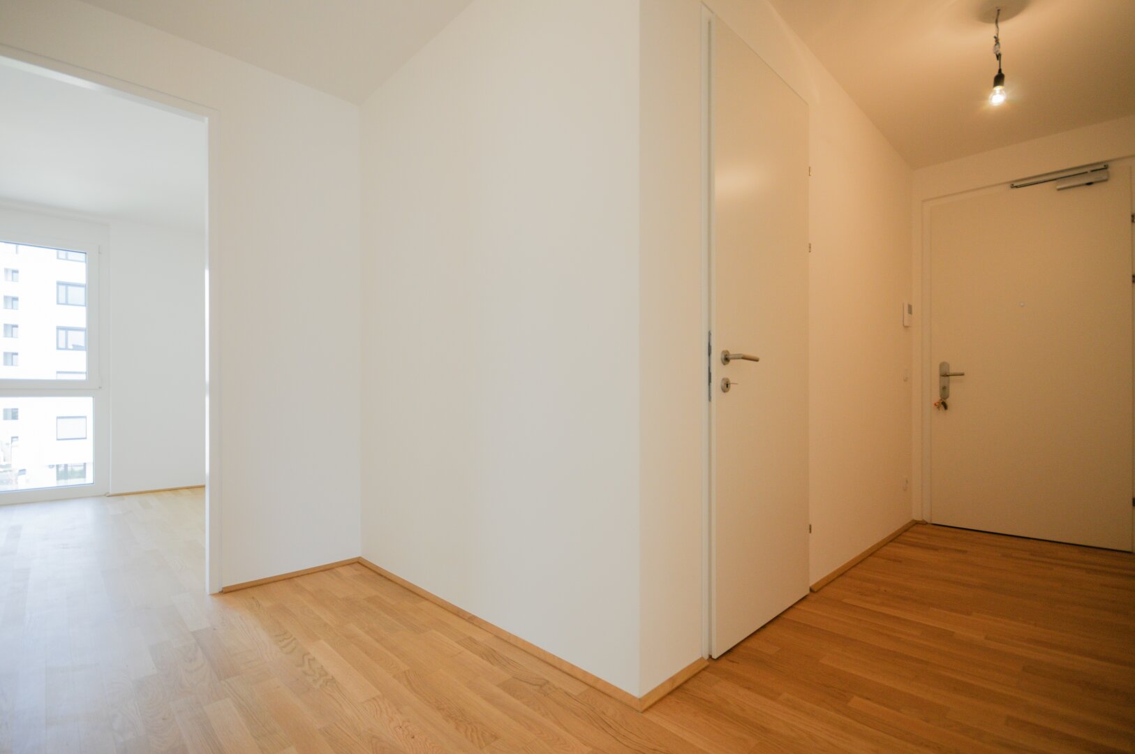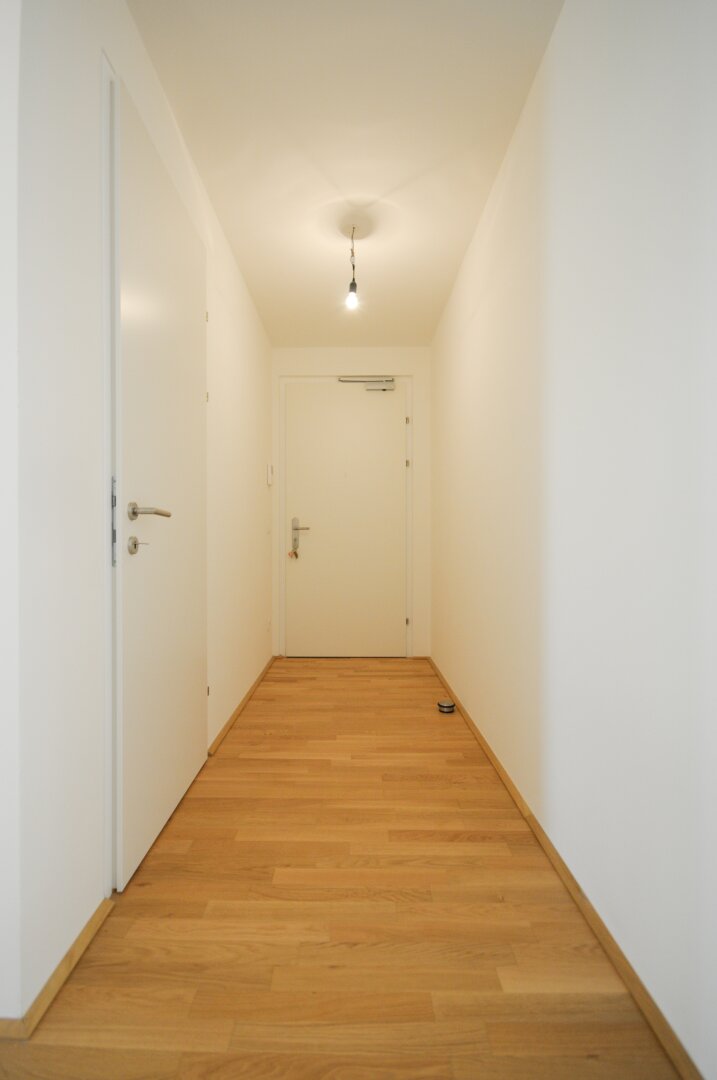 Man betritt die im zweiten Obergeschoss liegende 2-Zimmer-Wohnung mit 50,39 m² Größe über einen rund 9 m² großen Vorraum, von welchem sämtliche Räumlichkeiten der Wohnung zentral begehbar sind.
