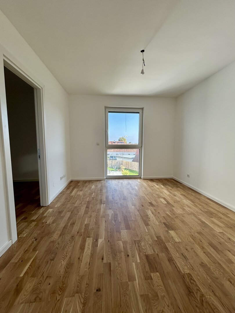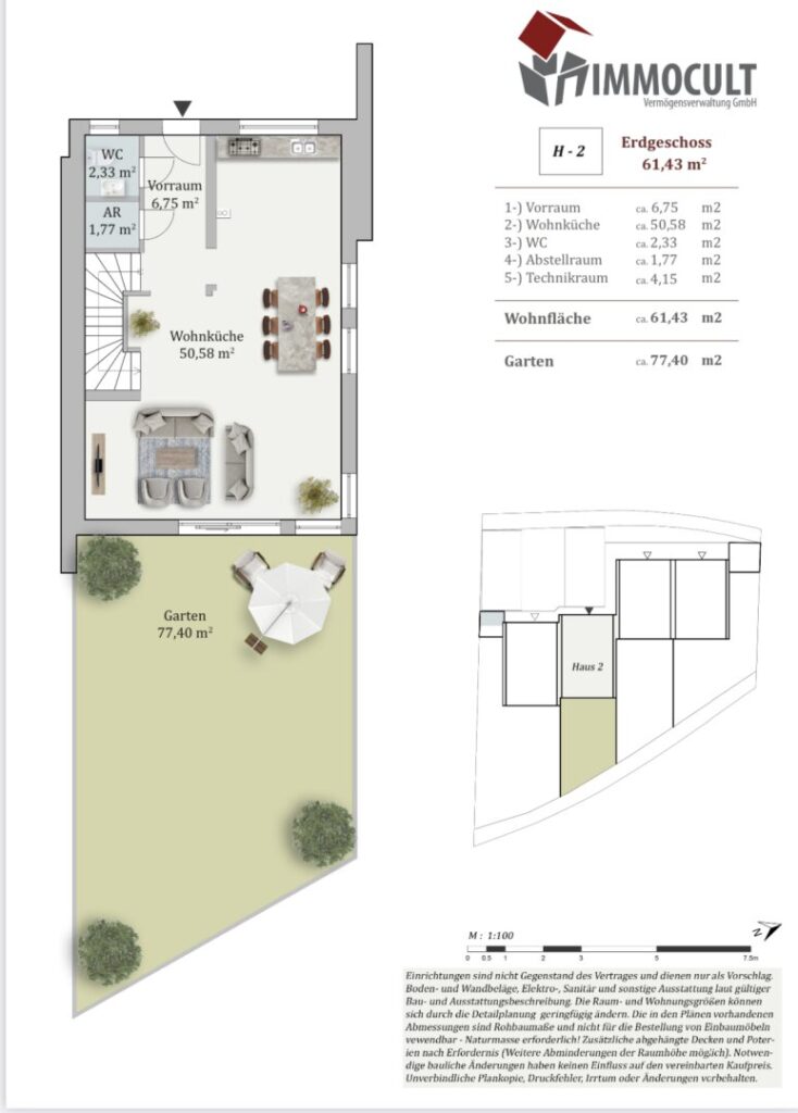 Man betritt das Haus und befindet sich im Vorraum, separate Gäste-Toilette mit Handwaschbecken und ein Abstellraum, Der Wohnbereich selbst umfasst rund 50 m² und inkludiert in der aktuellen Planung eine offene Küche sowie das Ess- und Wohnzimmer. Von hier aus gelangt man direkt auf die traumhafte Terrasse, sowie in den Eigengarten, der mit ca. 77 m² ist.
