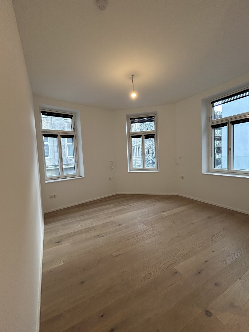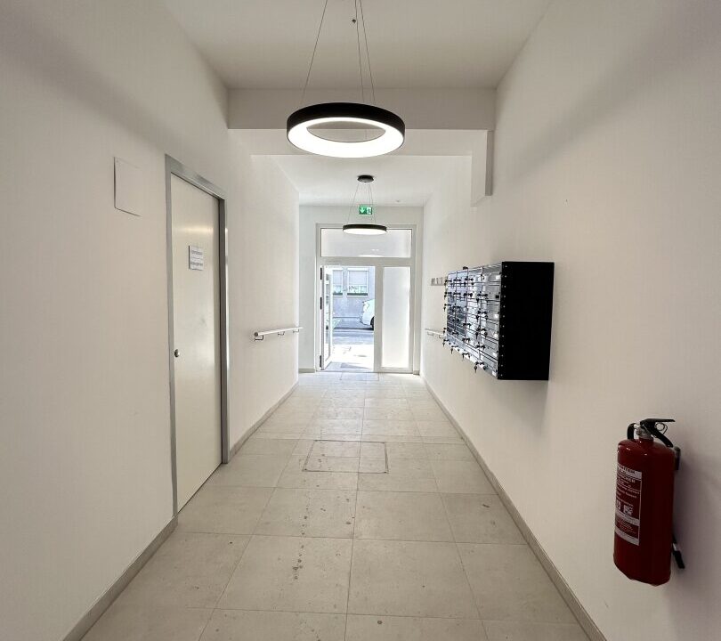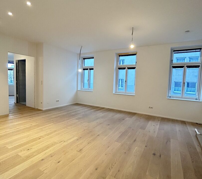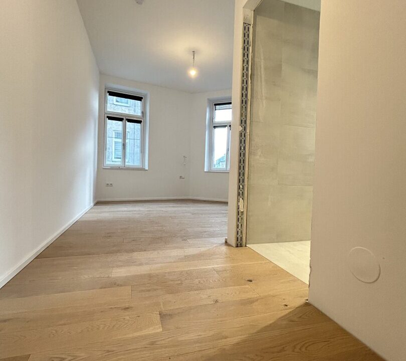 Über den Vorraum betritt man die komplett sanierte 58,28 m2 große Wohnung. Direkt vis à vis vom Eingang befindet sich die Garderobe, die genügend Platz für einen Kasten bietet und von wo man auch zum WC gelangt. Vom Vorraum aus erstreckt sich zur Rechten die Kochnische, wo auch der Waschmaschinenanschluss zu finden ist und alle Anschlüsse für eine Küchenzeile vorbereitet sind. Im anschließenden Wohnraum mit knapp 23 m2 kann sowohl ein Essbereich als auch ein gemütlicher Wohnbereich mit Couch und Sideboard gestaltet werden. Der angrenzende Schlafbereich mit viel Tageslicht bietet auf über 16 m2 genügend Raum für ein komfortables Doppelbett als auch einen Kleiderschrank. Das Badezimmer mit Waschtisch, Dusche und Tageslichtfenster ist direkt über den Schlafraum erreichbar und hochwertig ausgestattet.