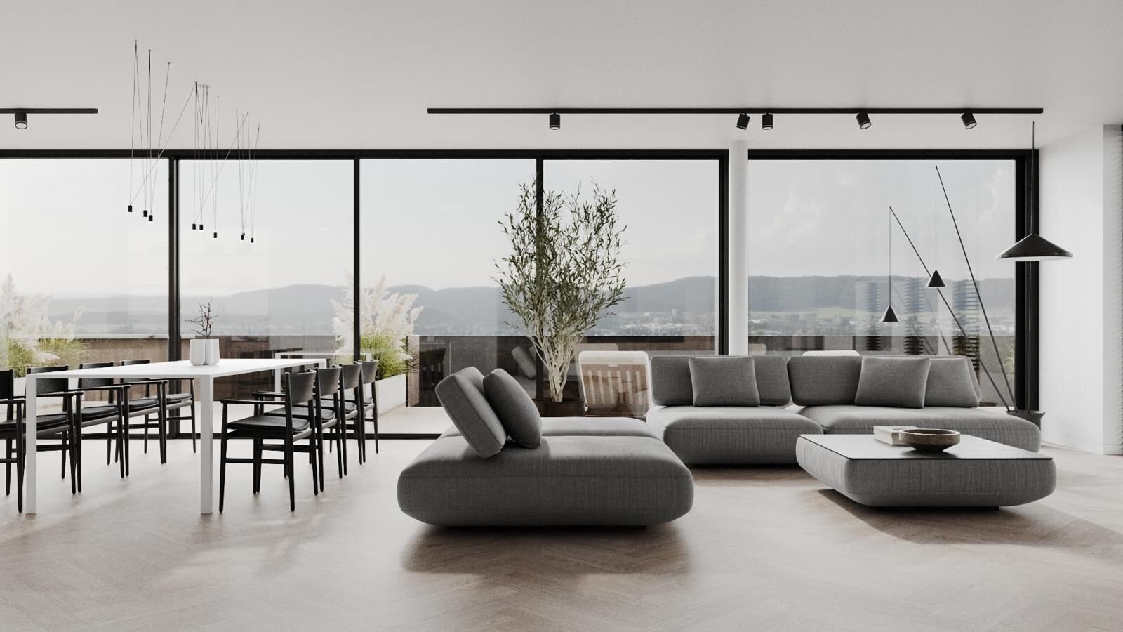 Eine Etage höher entfaltet sich der zentrale Wohnbereich: ein großflächiger, repräsentativer Raum mit Zugang zur ostseitigen Panoramaterrasse (87 m²). Ob Frühstück in der Morgensonne, entspannte Lektüre mit Blick auf die Weinreben oder gesellige Abende unter freiem Himmel – dieser Außenbereich wird zu Ihrem privaten Rückzugsort mit Naturkulisse mitten in der Stadt.
