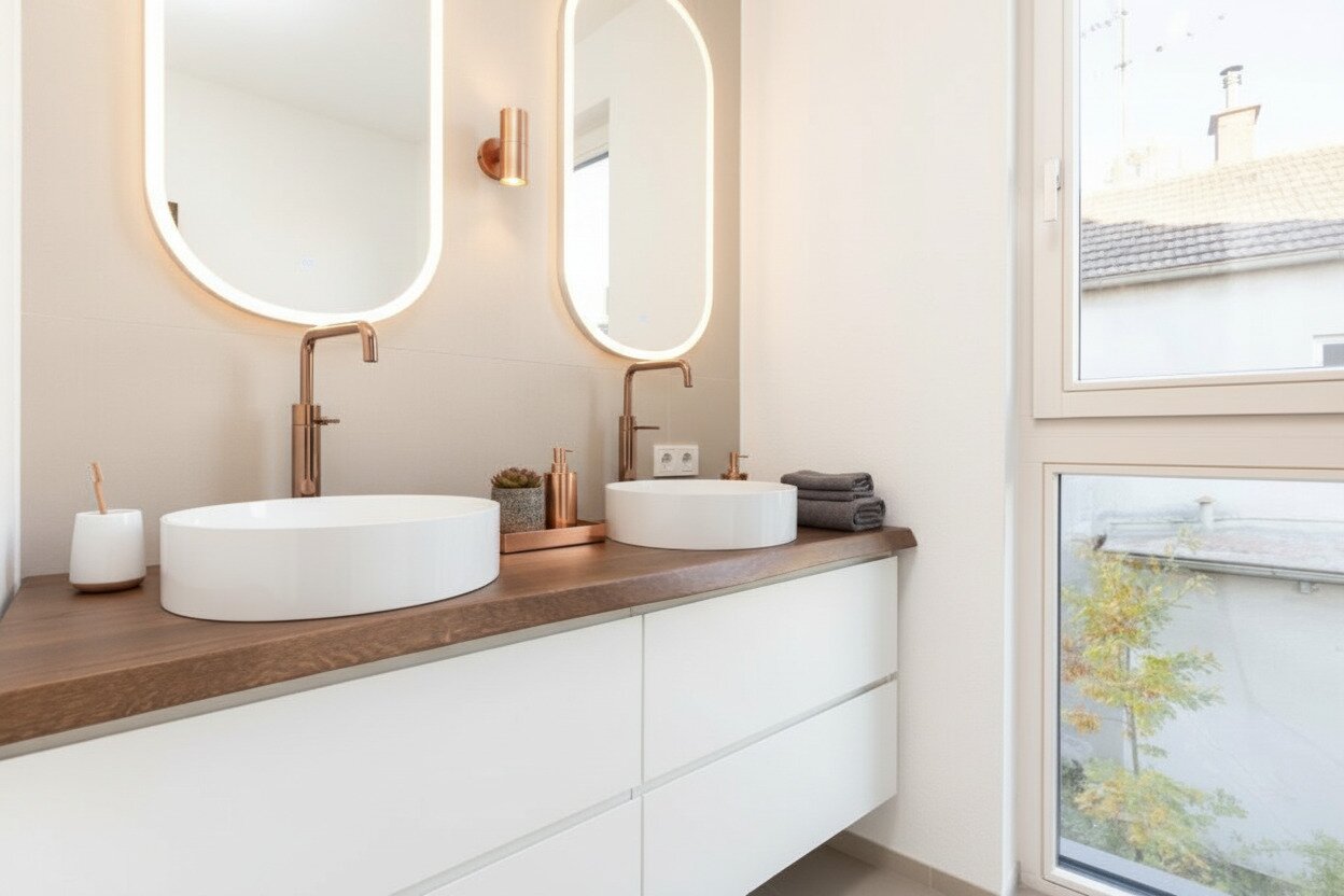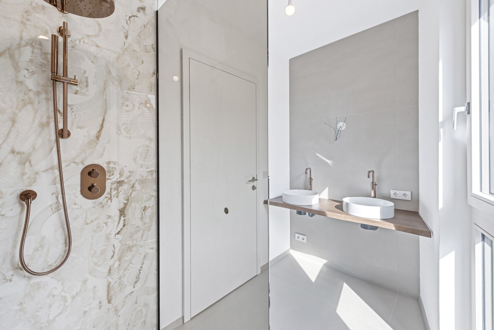 Die Bäder sind mit Burgbad-Waschbecken und Waschtischplatten ausgestattet. Burgbad ist seit 2016 klimaneutral und trägt renommierte Nachhaltigkeitssiegel wie Blauer Engel und EcoVadis Bronze. Mineralguss-Waschbecken bestehen zu rund 80 % aus natürlichen Rohstoffen. Der innovative CleanFlow-Siphon reduziert Wasserverbrauch, Materialeinsatz und Reinigungsmittel – ein perfektes Zusammenspiel von Design, Hygiene und Nachhaltigkeit.