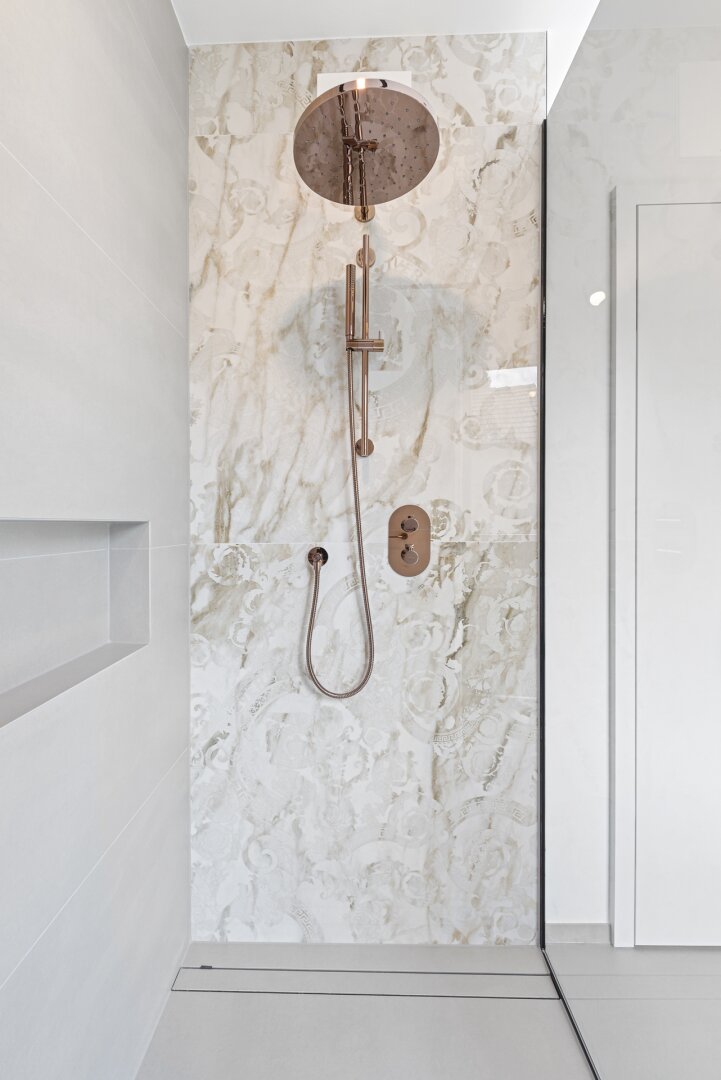 Ein besonderes Highlight bilden die Versace-Fliesen in den Duschen: luxuriöse Akzente, die italienische Designästhetik mit der Langlebigkeit keramischer Werkstoffe verbinden. Keramik ist nicht nur pflegeleicht und wasserresistent, sondern auch recyclingfähig – so wird Glamour Teil einer nachhaltigen Architektur.