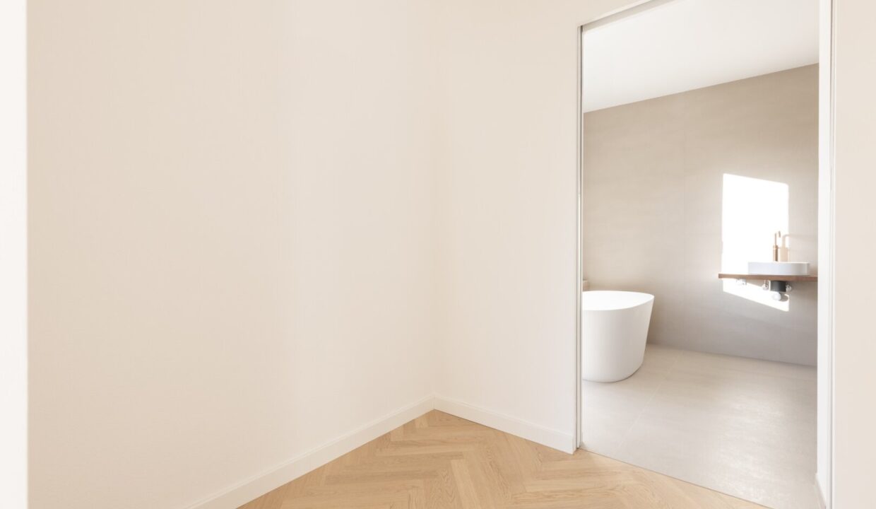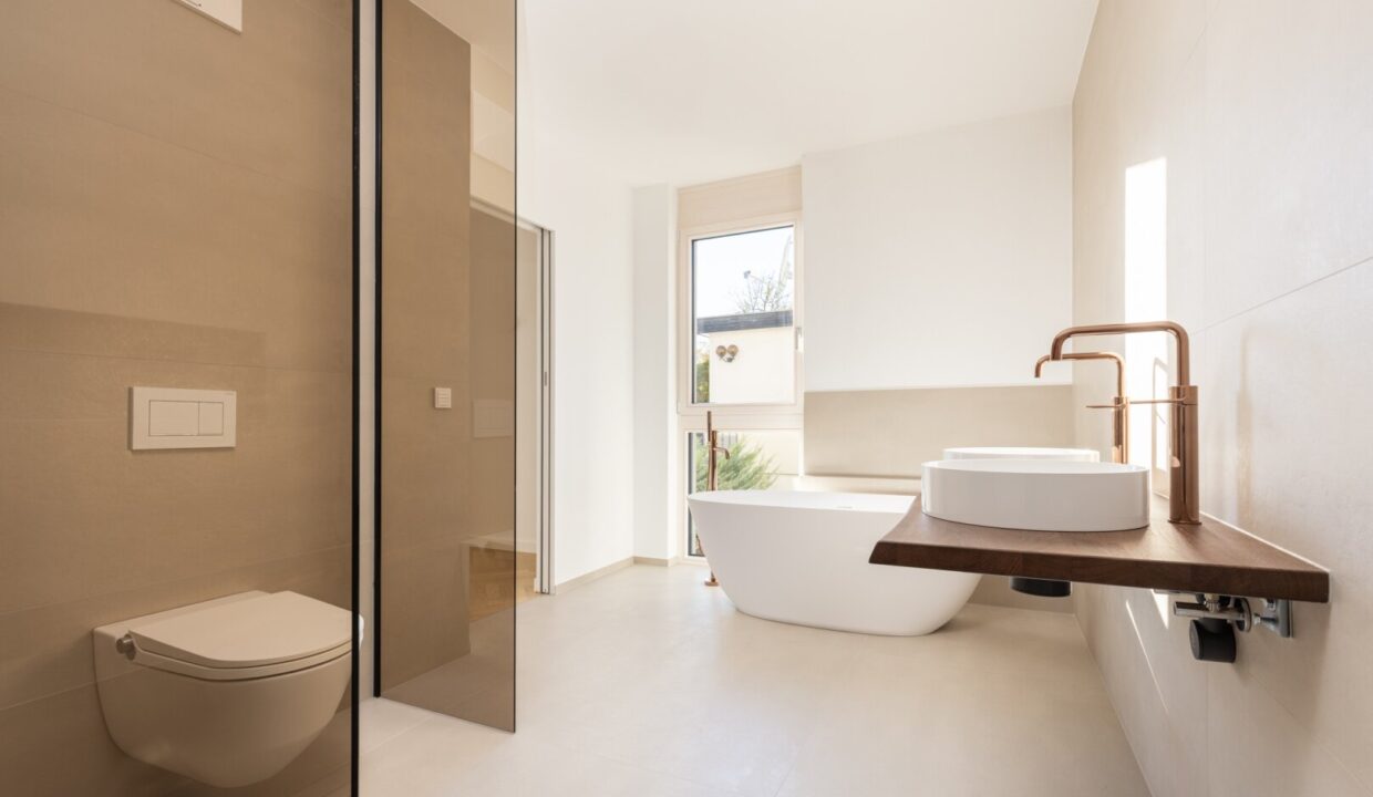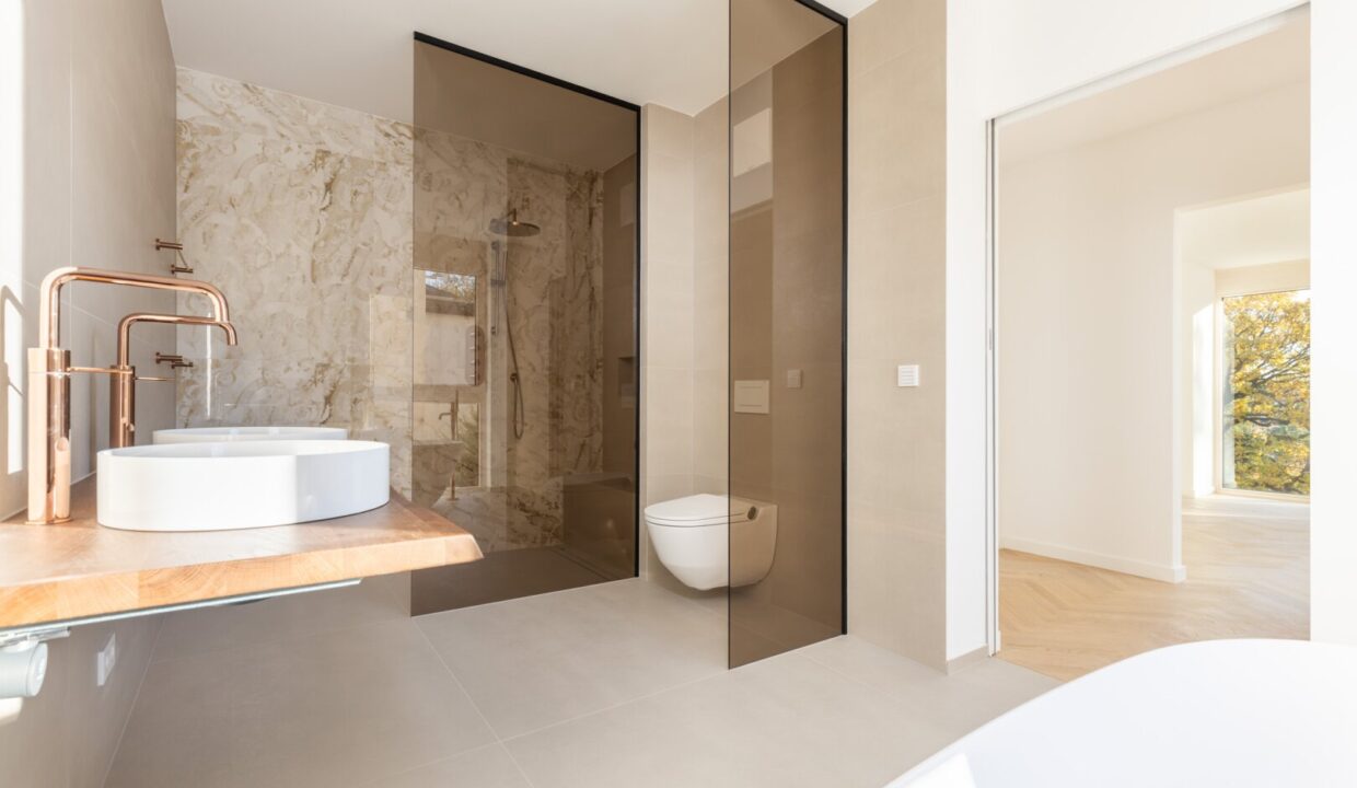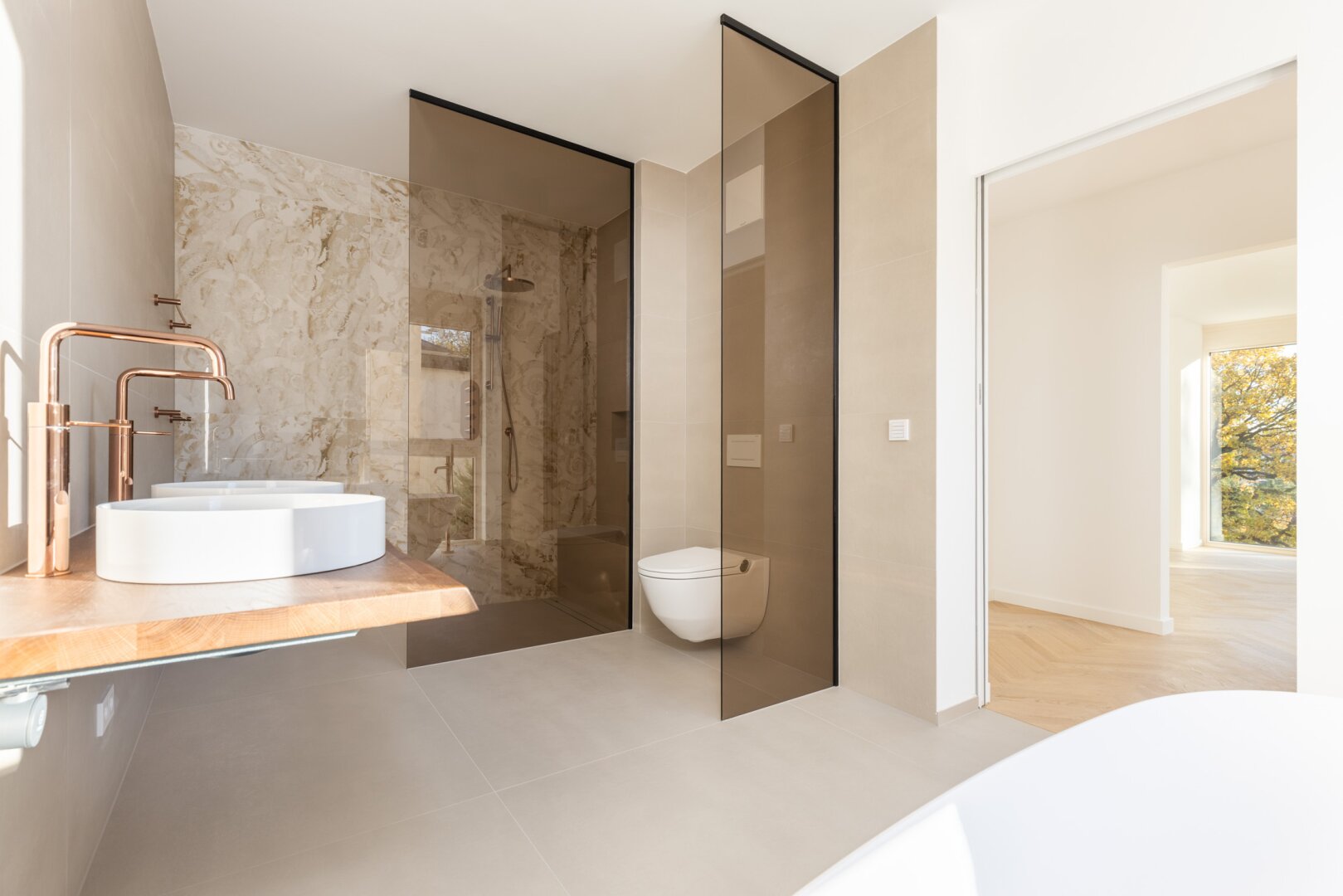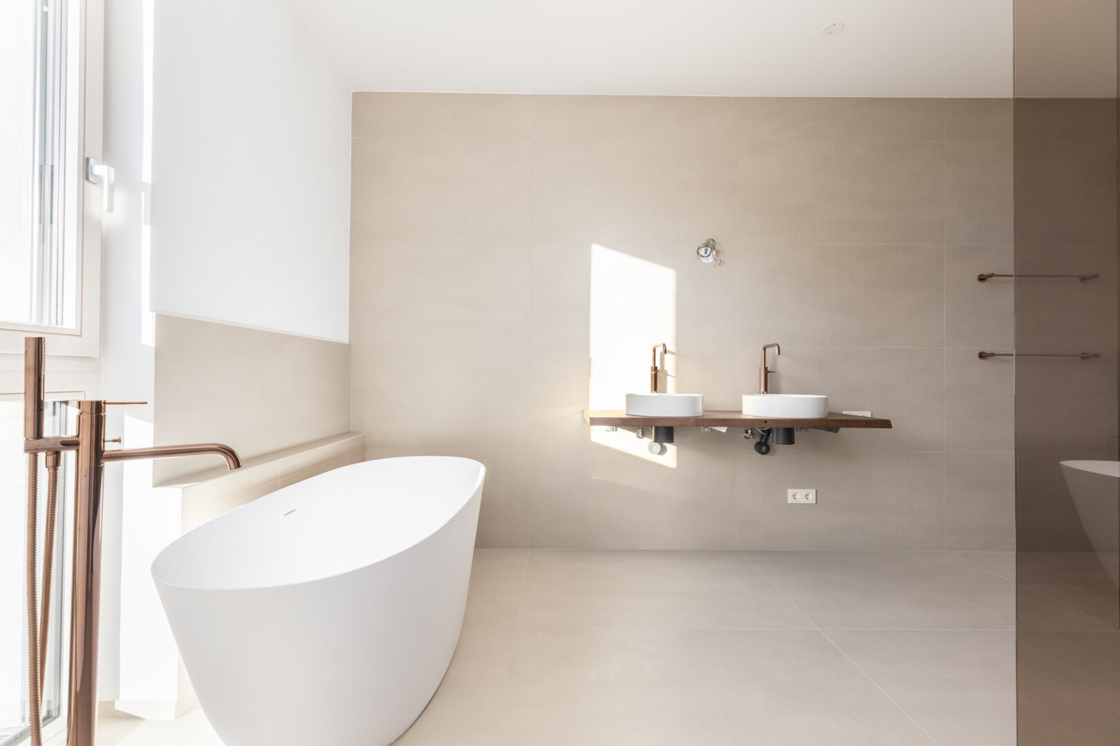 In Bädern und auf Terrassen kommt großformatiges Feinsteinzeug zum Einsatz: