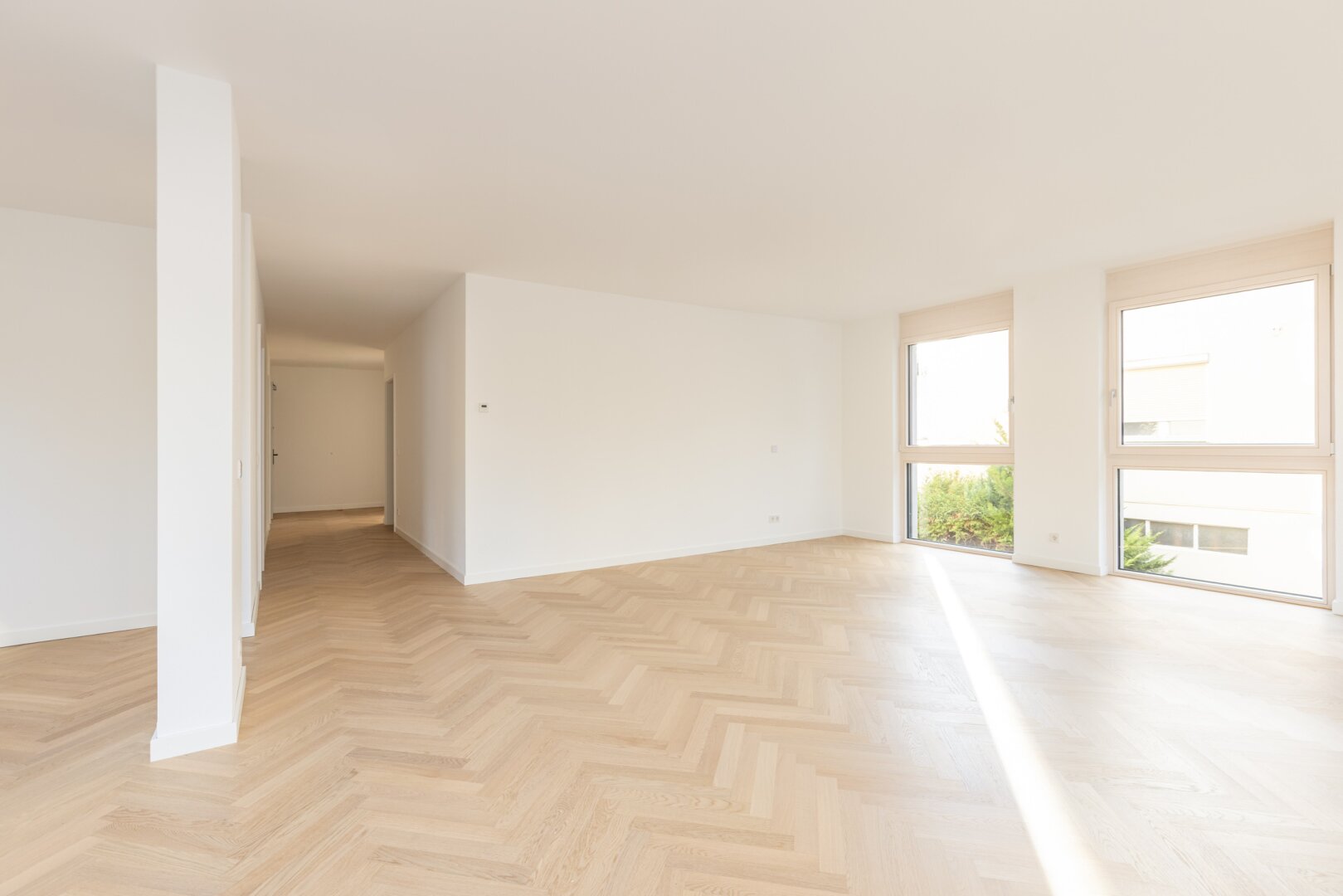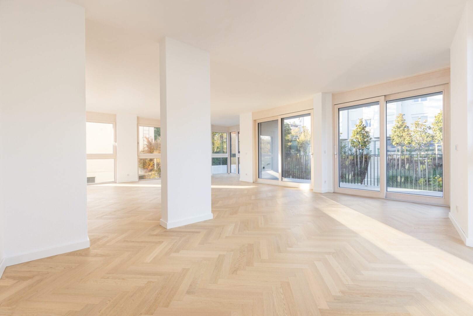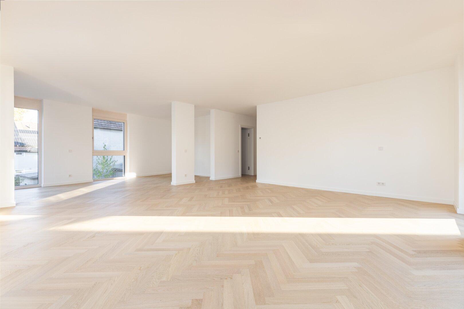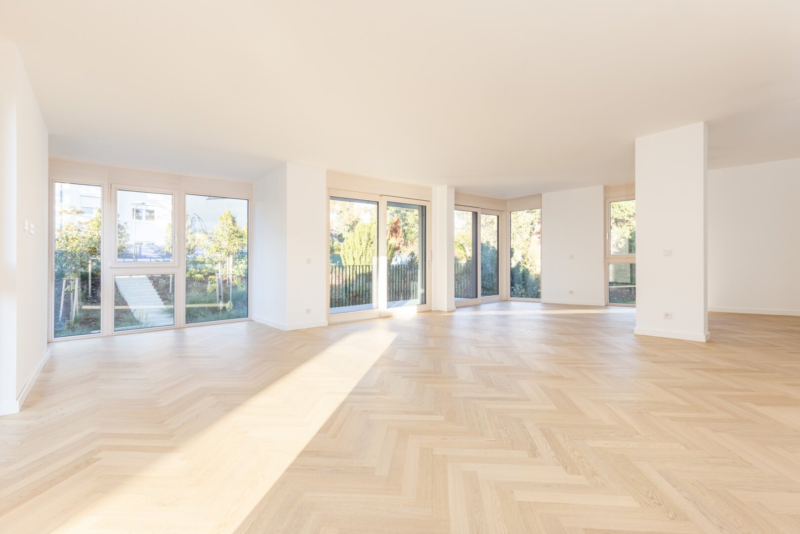 Die Ausstattung besticht durch eine Auswahl erlesener Materialen. Formschöne Eleganz bei hochwertigem Parkett (Fischgrät Optik) trifft großformatiges Feinsteinzeug sowie durchdachte Lichtplanung, gesundheits- und raumklimabewusste Wandgestaltung (Lehmputz in den Schlafbereichen), zukunftsweisende Kühlung und Heizung (Luftwärmepumpe) und generelle stimmige, zeitlos elegante Ausführung im Designkonzept und überhohe Türen.
