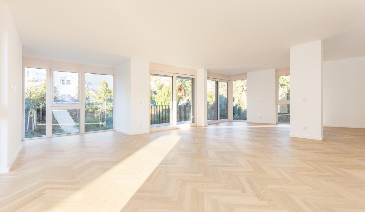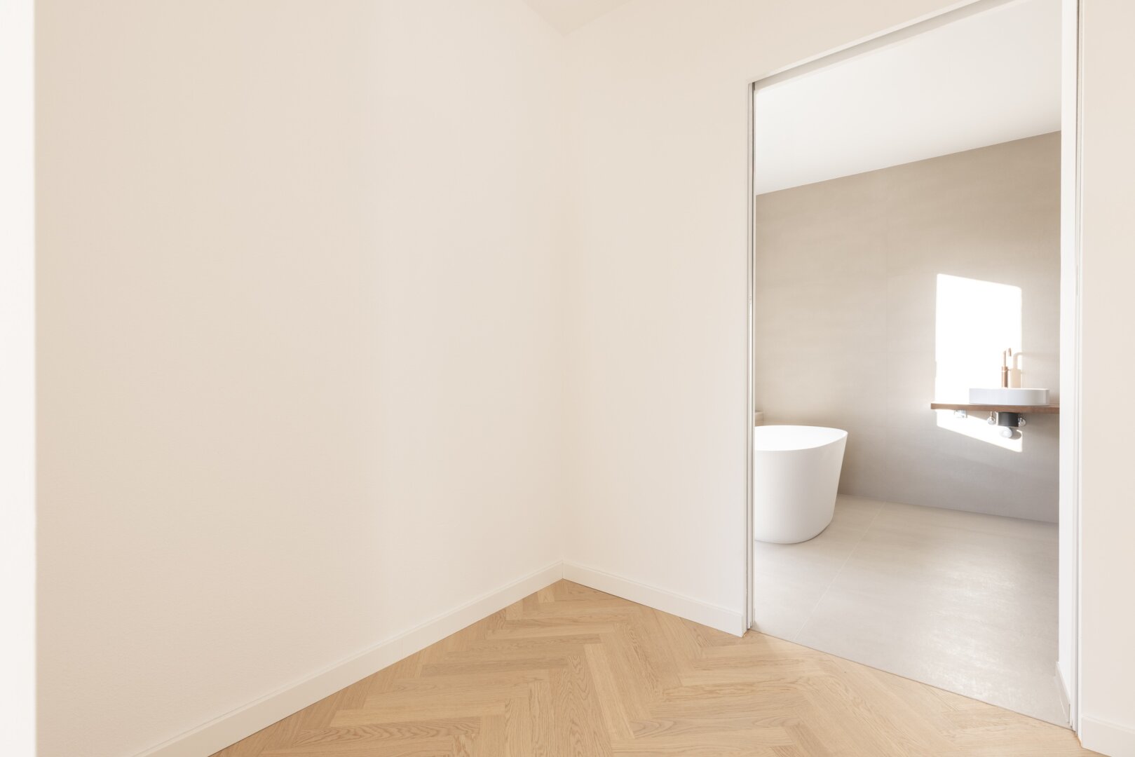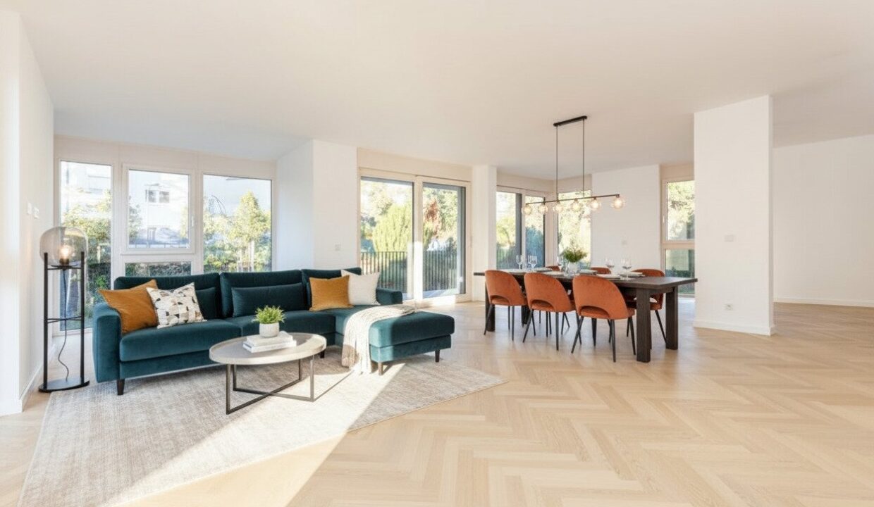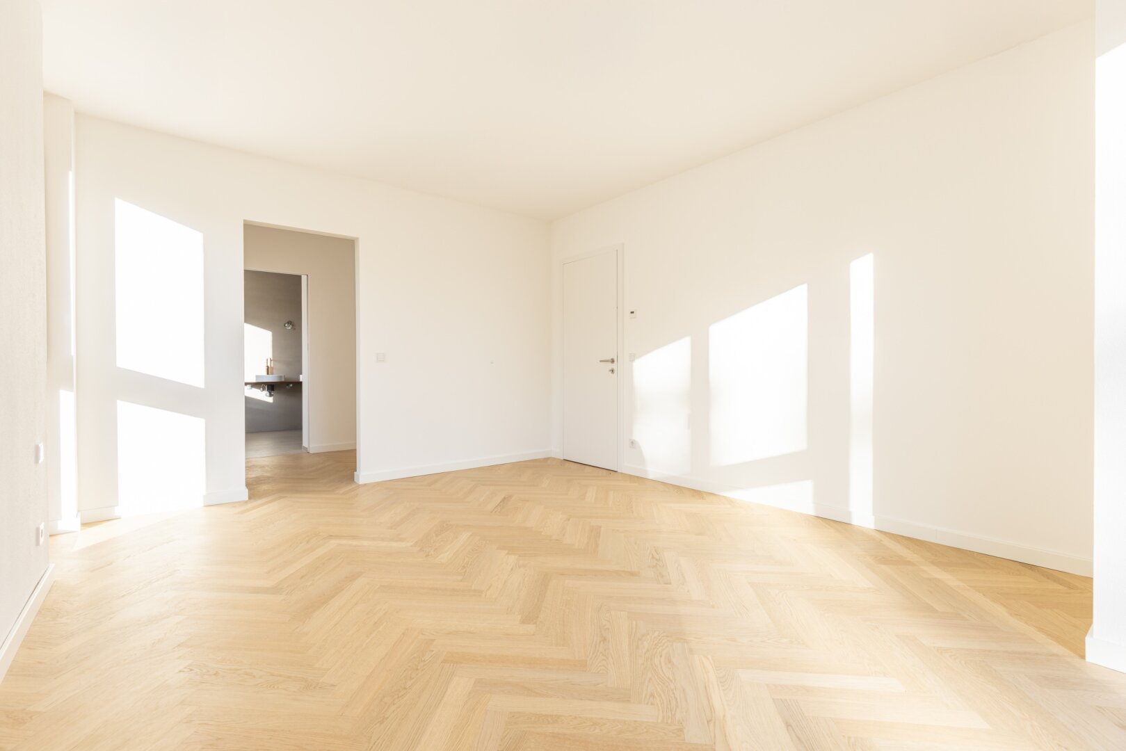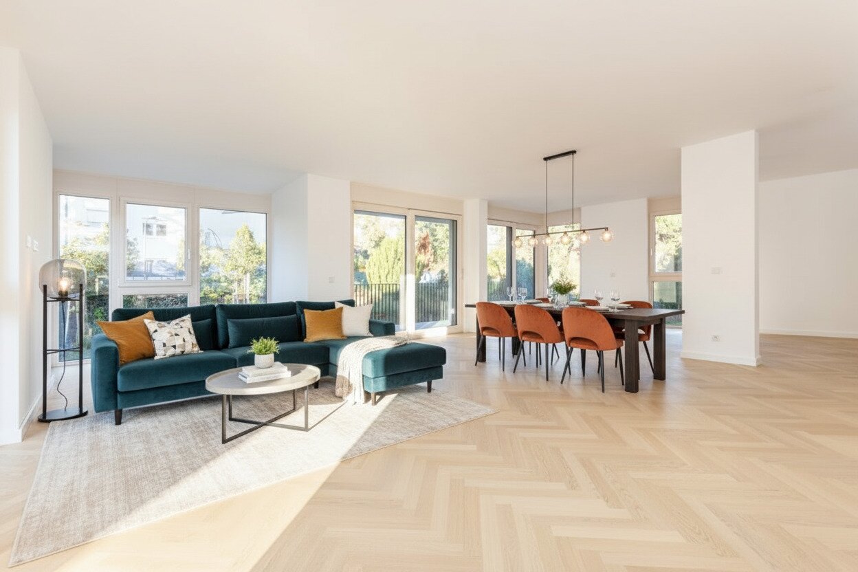 Die Ausstattung besticht durch eine Auswahl erlesener Materialen. Formschöne Eleganz bei hochwertigem Parkett (Fischgrät Optik) trifft großformatiges Feinsteinzeug sowie durchdachte Lichtplanung, gesundheits- und raumklimabewusste Wandgestaltung (Lehmputz in den Schlafbereichen), zukunftsweisende Kühlung und Heizung (Luftwärmepumpe) und generelle stimmige, zeitlos elegante Ausführung im Designkonzept und überhohe Türen.