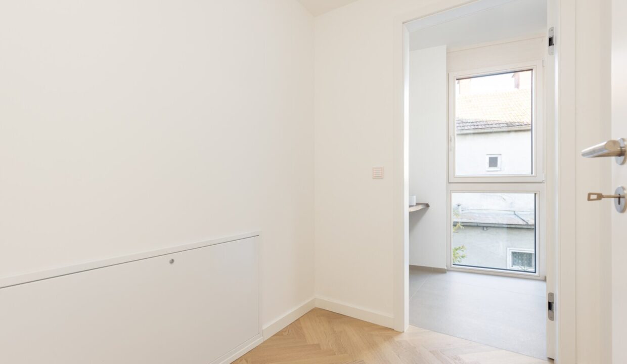 Ein Abstellraum mit Waschmaschinenanschluss ist ebenfalls vom Vorraum aus zu begehen, bevor man in den Wohnbereich gelangt. Dieser ist vom Vorraum mittels Schiebetür auch verschließbar und somit von dem anderen Bereich der Wohnung akustisch abtrennbar.