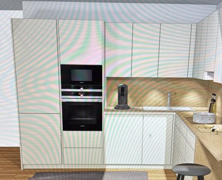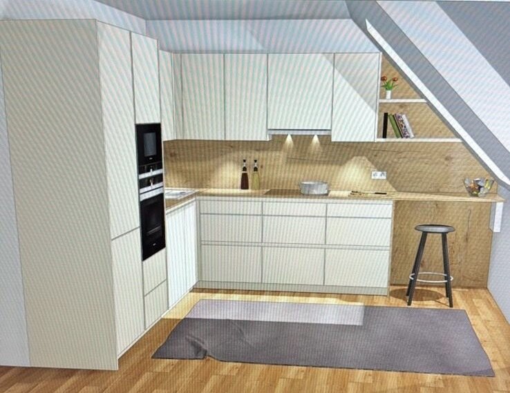 Die offen in den Wohnbereich integrierte Küche ist mit sämtlichen Geräten ausgestattet und ist selbstverständlich Teil der hochwertigen Ausstattung. Auch hier finden Sie ausreichend Platz für Stau- und Arbeitsflächen.