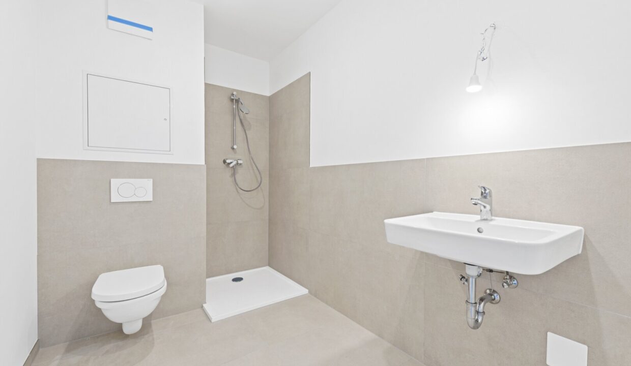 Das Badezimmer wurde mit einer Dusche sowie einem Waschbecken und einer Toilette ausgestattet.